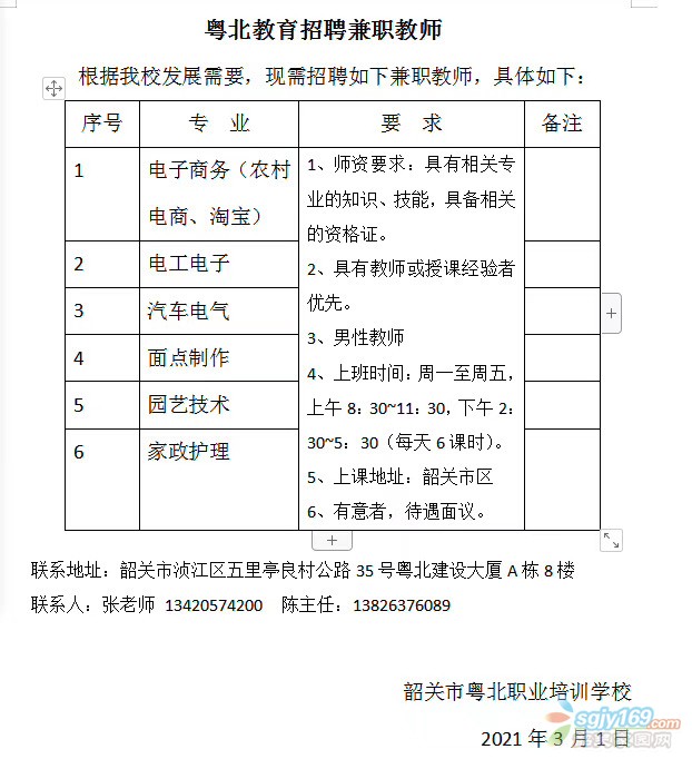 正文摘要:兼職招聘 粵北教育是開(kāi)展學(xué)歷提升和職業(yè)技能培訓(xùn)、政府、企事業(yè)培訓(xùn)的專業(yè)培訓(xùn)單位。根據(jù)我校發(fā)展需要,現(xiàn)需招聘如下專業(yè)的兼職老師,歡迎有意向的您加入: 招聘:電子商務(wù)(農(nóng)村電商、淘寶)、電子電工、汽車電氣 ... |